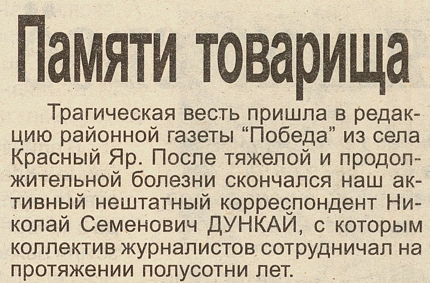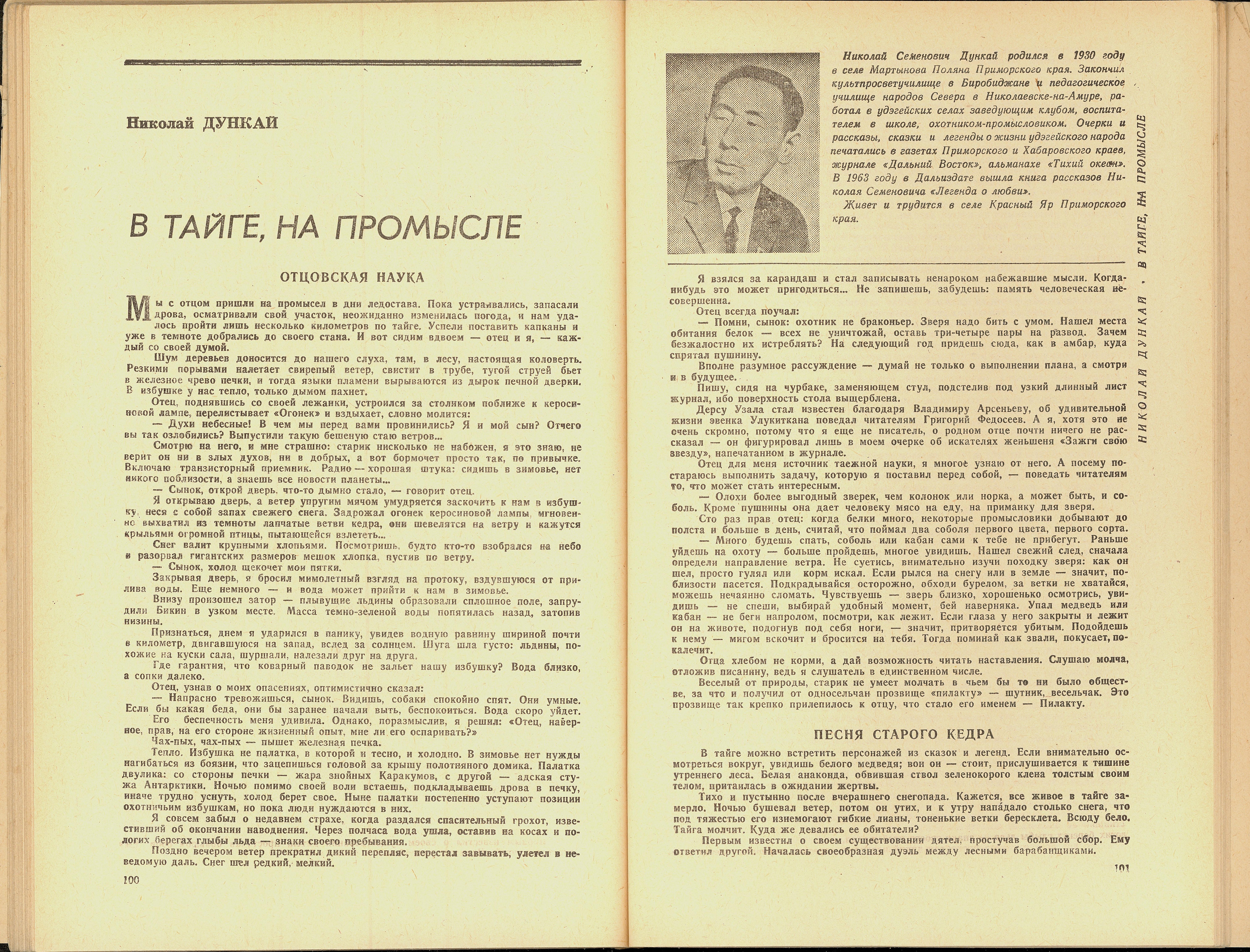 Свою творческую деятельность Николай Семёнович начинал с небольших заметок о жизни людей, живущих и работающих в тайге, о красоте окружающей природы. Первые охотничьи рассказы, очерки, повести, удэгейские сказки Н.С. Дункая были опубликованы сначала на страницах районной газеты «Победа». Как упоминает редакция газеты – Николай Семенович был внештатным корреспондентом на протяжении полусотни лет4.
