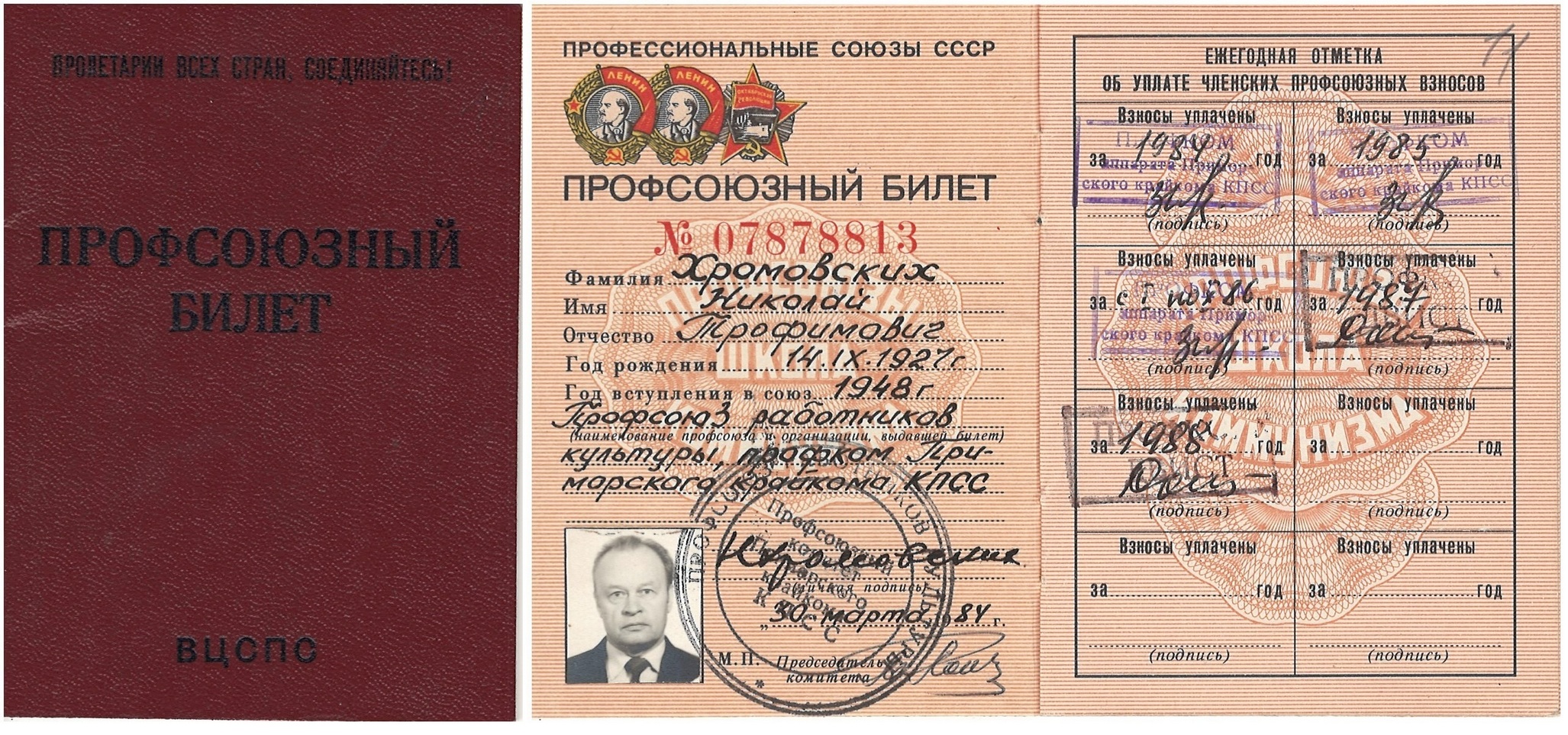 Профсоюзный билет Хромовских Николая Трофимовича – партийного деятеля, участника хозяйственного строительства в Приморье, кандидата экономических наук. В течение 16 лет был секретарем Приморского крайкома КПСС.