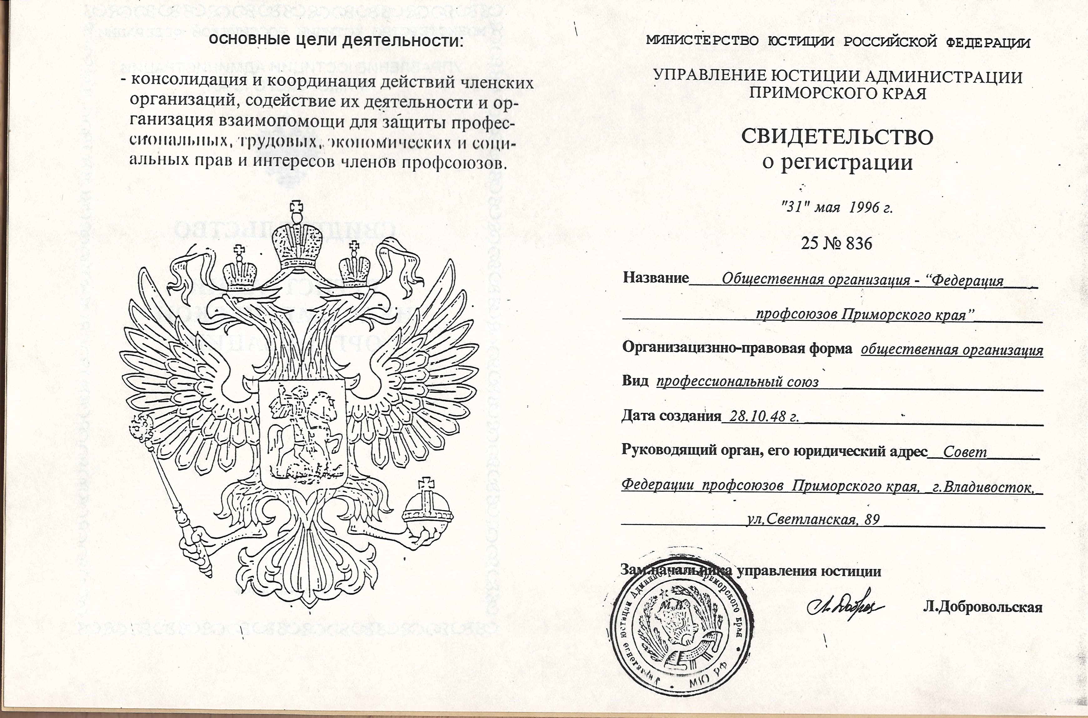 29 ноября 1995 г. на 2-ой отчетно-выборной конференции Федерации профсоюзов Приморского края был утвержден Устав Федерации профсоюзов Приморья и зарегистрирован в управлении юстиции края 31 мая 1996 г.