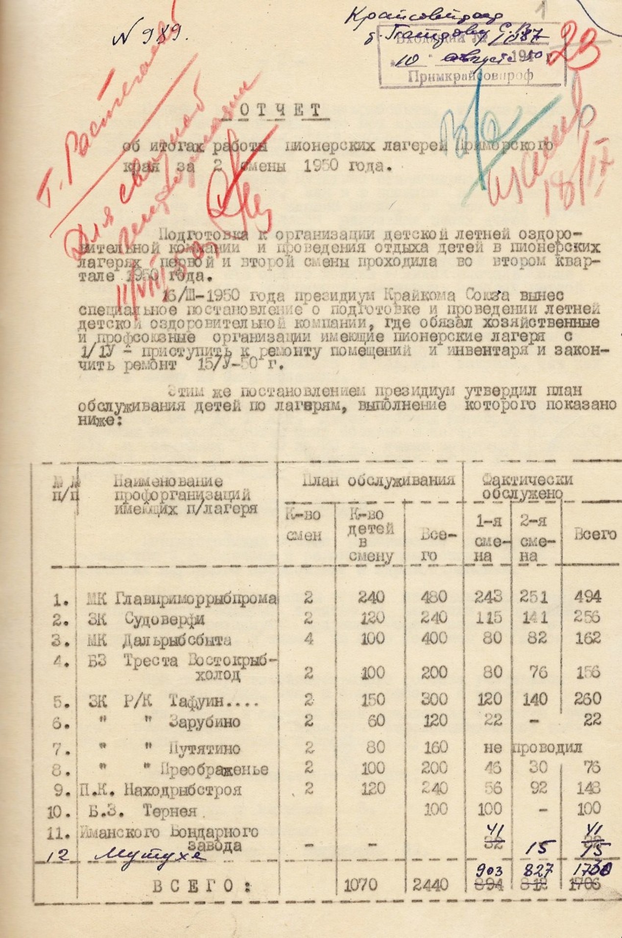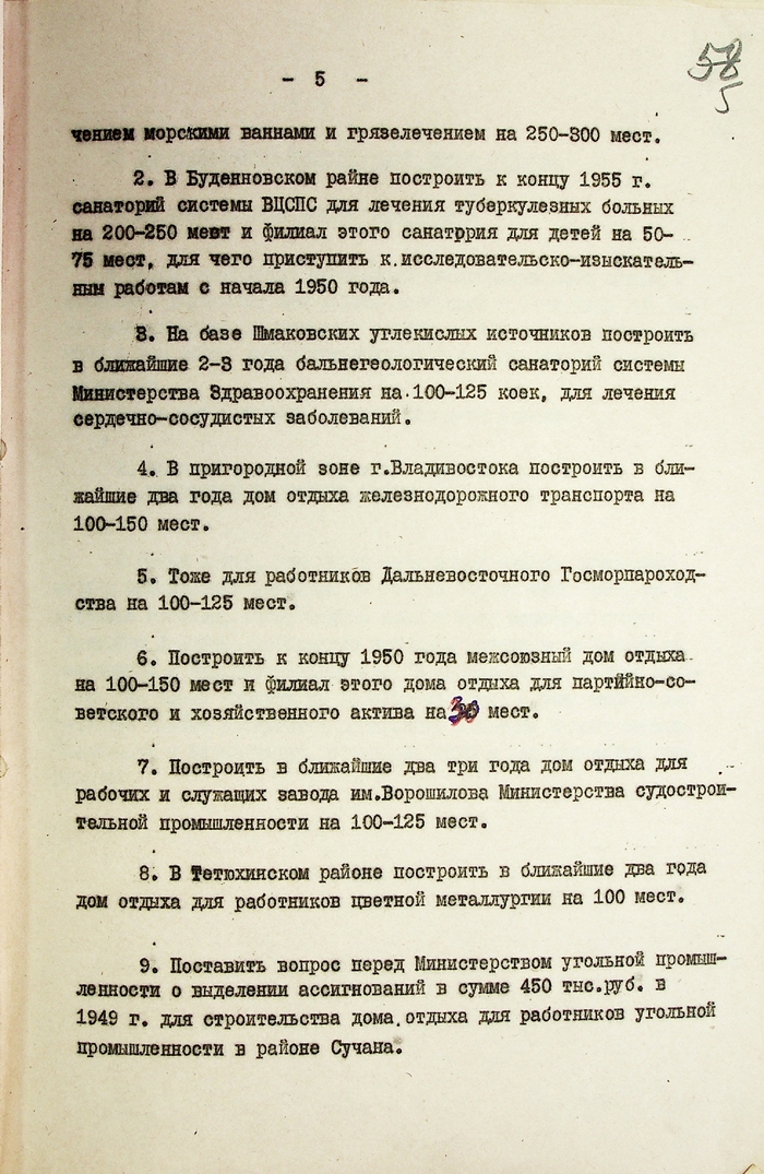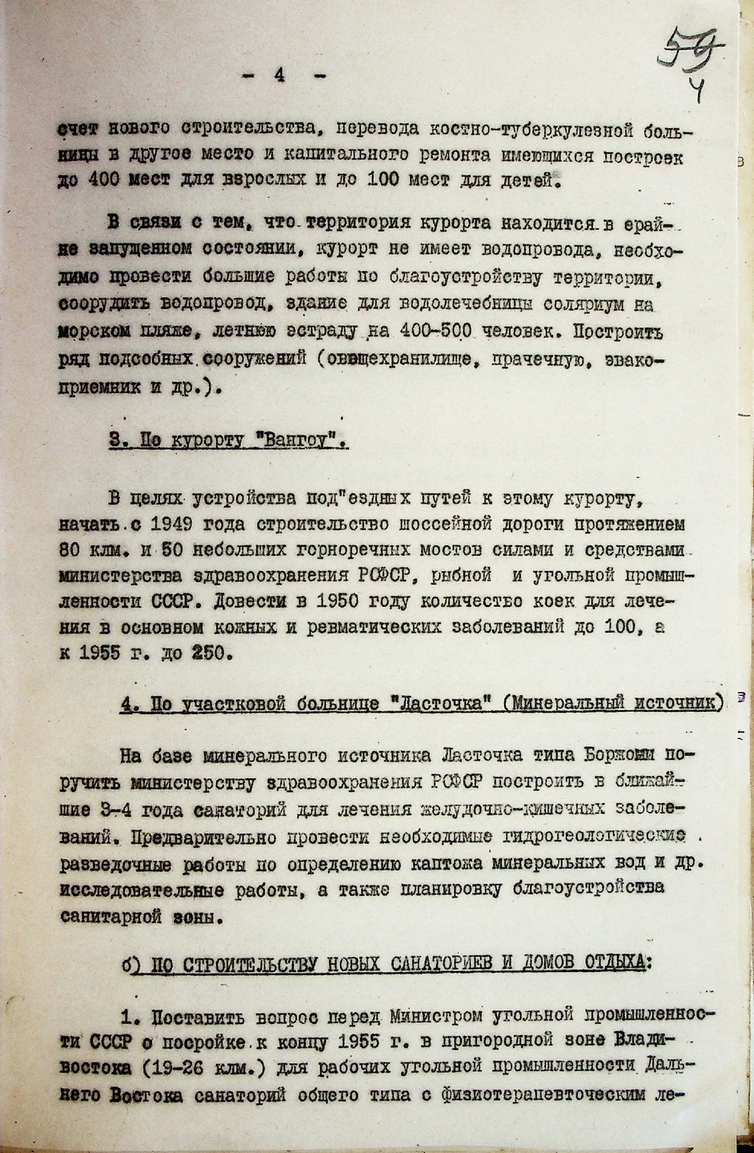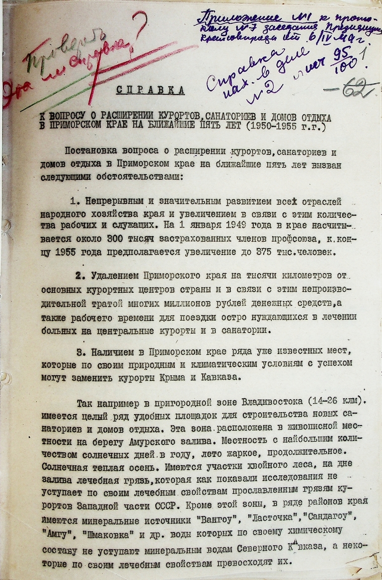 В связи с ростом промышленности на Дальнем Востоке, увеличивался контингент трудящихся, тем самым созрела острая необходимость в потребности расширения коечного фонда и пропускной способности домов отдыха, санаториев. Профсоюзы Приморья уже в 1949 г. разработали целый комплекс возможных решений для развития санаторно-курортного лечения и профилактики трудящихся в крае.