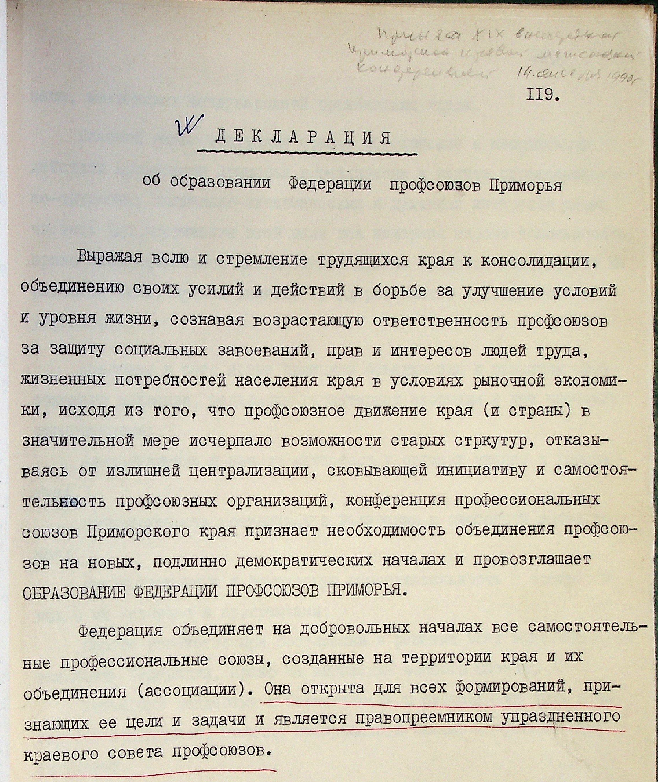 14 сентября 1990 г. была принята декларация, которая провозглашала образование Федерации профсоюзов Приморья.