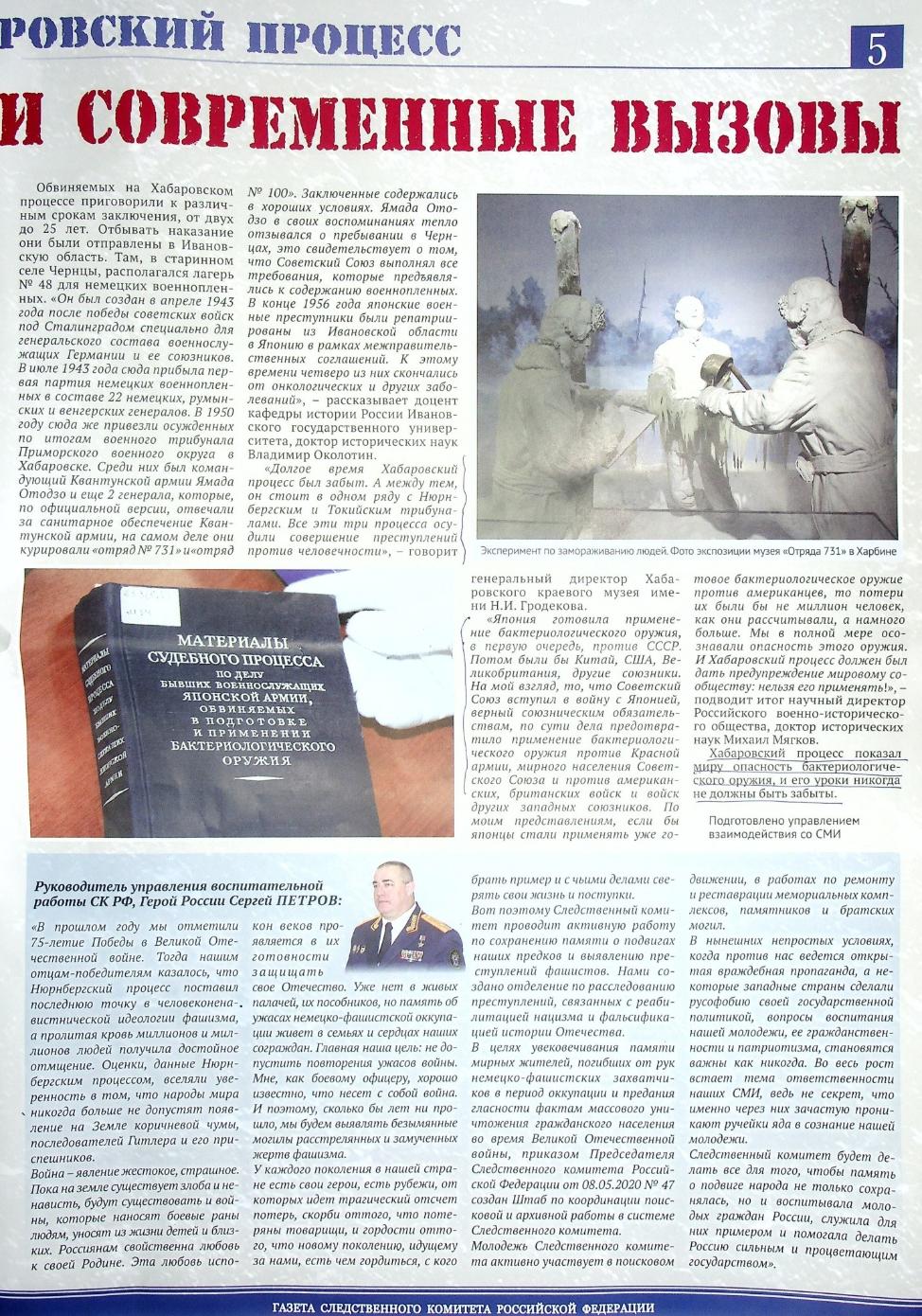 Хабаровский процесс 1949 года по праву занимает в истории своё место. 25-30 декабря 1949 г. в Хабаровске военный трибунал Приморского военного округа рассмотрел дело по обвинению японских военных в подготовке и применении бактериологического оружия и осудил преступников (в рамках Токийского процесса военные преступники-разработчики и применители бактериологического оружия осуждены не были).