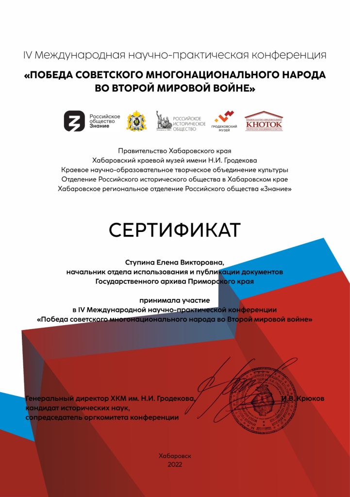 В октябре 2022 года в Хабаровске состоялась IV международная научно-практическая конференция «Победа советского многонационального народа во Второй мировой войне».
